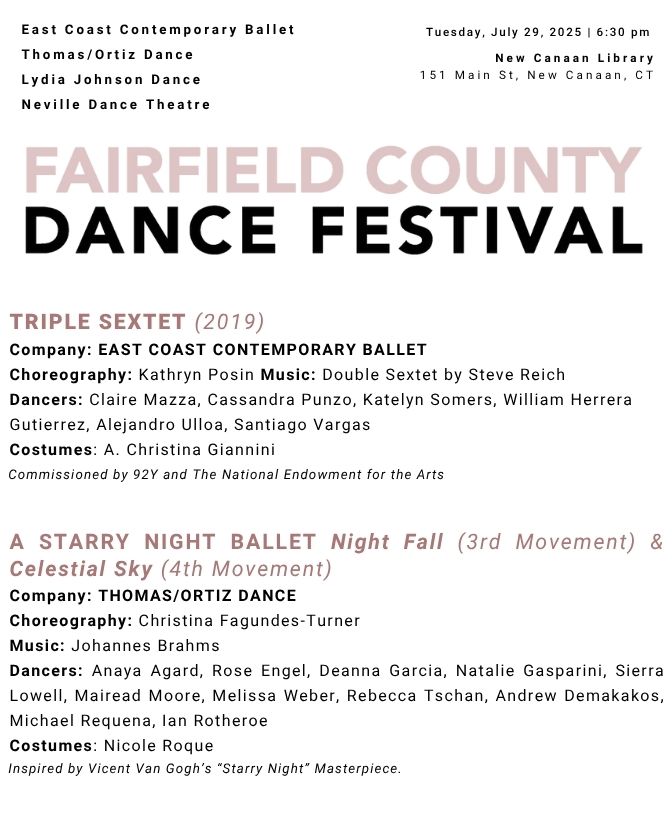 Enjoy a delightful summer evening of dance performances at the New Canaan Library! We’re thrilled to return to this beautiful venue and share the joy of dance in a stunning outdoor setting.